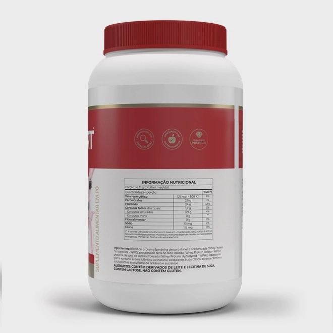Proteína concentrada do soro do leite (Whey Protein Concentrate – wpc), proteína isolada do soro de leite (Whey Protein Isolate ‘WPI), acidulante ácido cítrico, aroma idêntico ao natural de frutas vermelhas, espessante goma xantana, corante natural carmim, corante artificial vermelho ponceau e edulcorantes acessulfame K e sucralose.